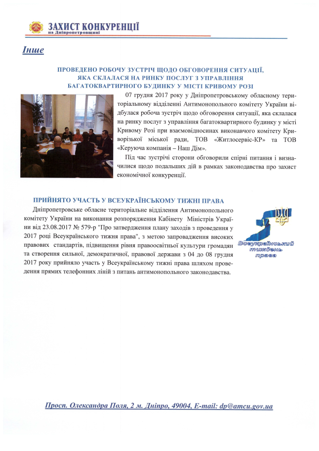 Порядок денний засідання адміністративної колегії Дніпропетровського обласного територіального відділення Антимонопольного комітету України 16 січня 2018 року