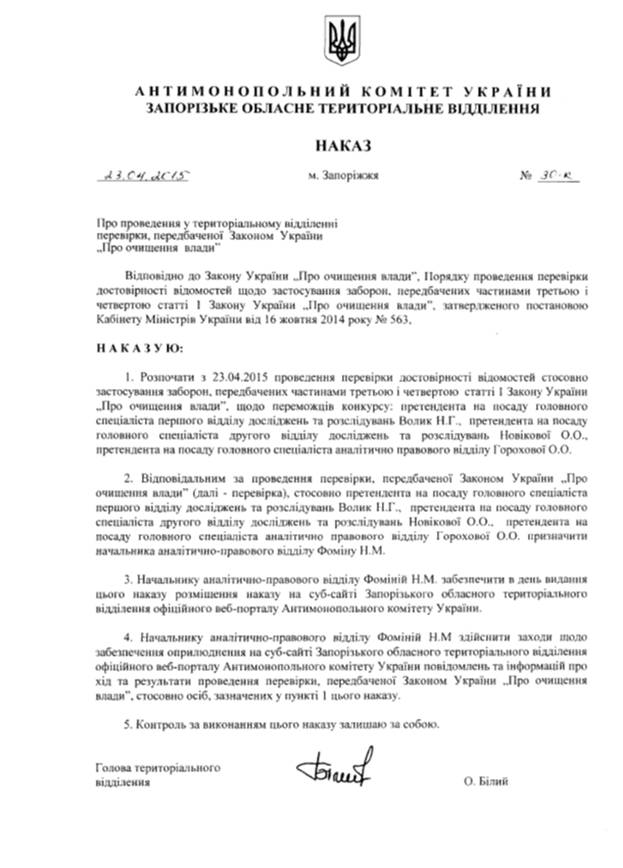 Наказ голови територіального відділення від 23.04.2015 № 30-к "Про проведення у територіальному відділенні перевірки, передбаченої Законом України "Про очищення влади"